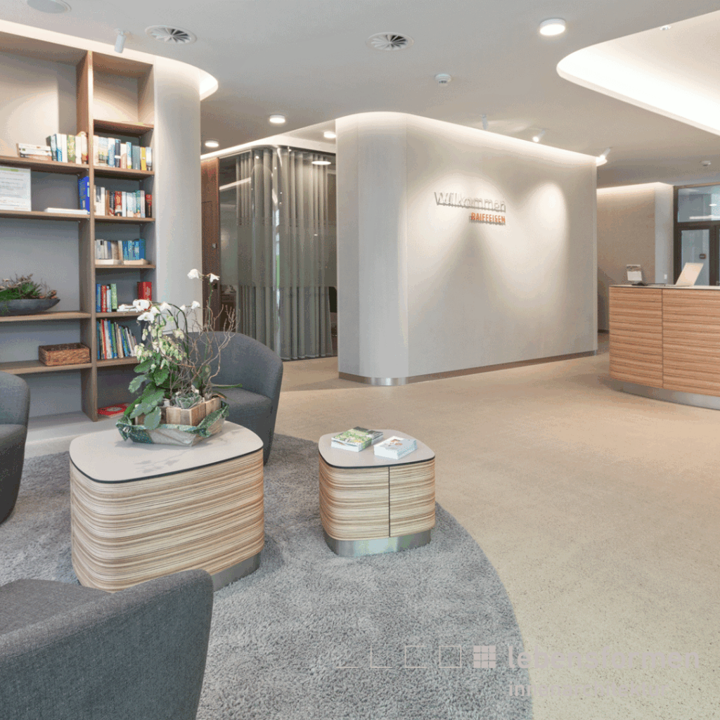 Ein weiteres Beispiel ist die Raiffeisenbank Niedergoesgen. Hier standen der Eingangsbereich und die Materialität im Zentrum. Zeitlose, massive Bauweise, edle Oberflächen und ein offenes Foyer schaffen Vertrauen – ein entscheidendes Gefühl für Kundinnen und Kunden, die eine Bank betreten. Ergänzend dazu entstand ein heller Besprechungsraum, der durch klare Linien, Glas und Möblierung Nähe und Offenheit fördert.